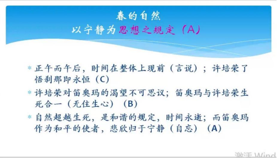 回顾主题,第一个出现的是思想之事,即冬天是战争和孤独;那么第二个主题是秋天讲思想本身的公正,只是讲思想本身。最后爱人死后许培荣无法克服自己思想的局限,所以思想的整体性规定必须再度出现,必须能够跨越思想和思想之间的隔阂、有限性。所以当春天再来的时候,是思想的规定即思想的无限的尺度再度现前。