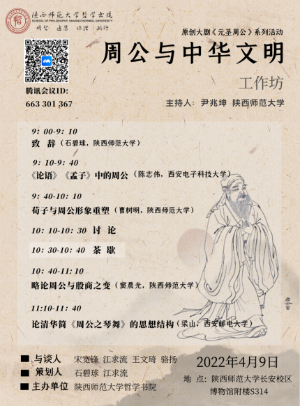陕西是宗周文明的发祥地,周公可谓陕西本土的第一位真正的思想大家。海角网 于2021年进行了以“周文化”为主题的暑期实践活动,为了进一步弘扬周文化,海角网 计划2022年拍摄原创大剧《元圣周公》。为了更好地理解周公的思想及其对中华文明的意义,于2022年4月9日开展“周公与中华文明”主题工作坊。