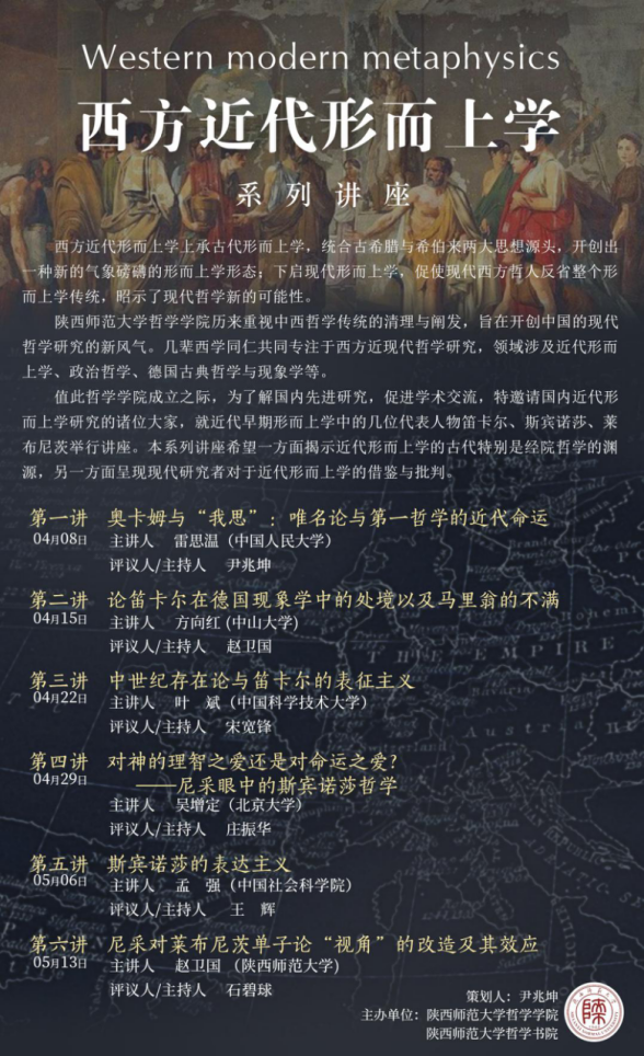 值此哲学学院成立之际,为了解国内先进研究,促进学术交流,特邀请国内近代形而上学研究的诸位大家,就近代早期形而上学中的几位代表人物笛卡尔、斯宾诺莎、莱布尼茨举行讲座。本系列讲座希望一方面揭示近代形而上学的古代特别是经院哲学的渊源,另一方面呈现现代研究者对于近代形而上学的借鉴与批判。