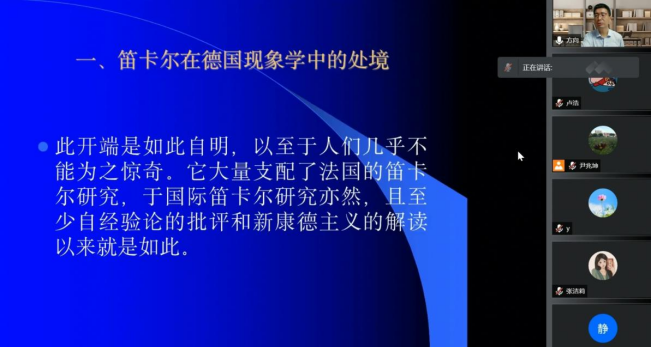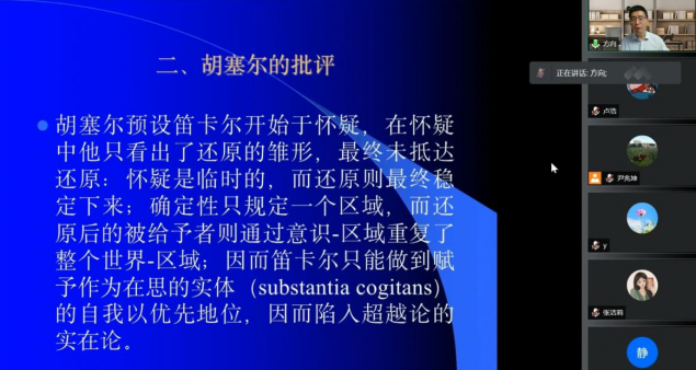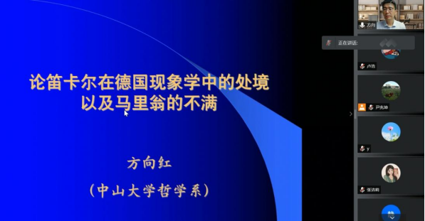20224月157点,西方近代形而上学系列讲座第二讲——“论笛卡尔在德国现象学中的处境以及马里翁的不满”于线上顺利开讲。本次讲座由中山大学哲学系教授方向红主讲,海角网 哲学系教授赵卫国主持,来自学校各学院计千余名师生在云端聆听本次讲座。