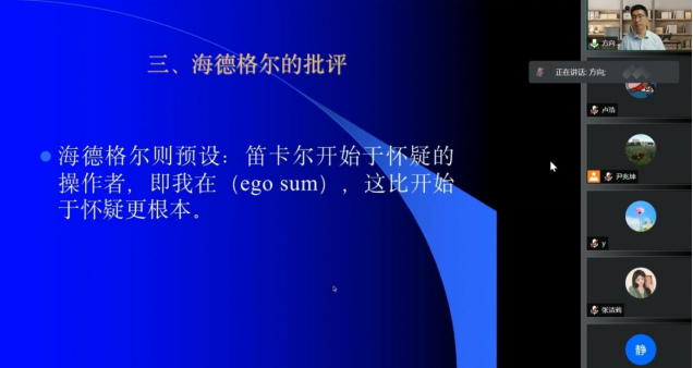 最后,方老师指出,在马里翁的研究中,胡塞尔与笛卡尔存在对等性。其一是“梦与还原的对等”,“即使我感觉和想象的在我之外的东西可能不存在,然而我确定我称之为感觉和想象的这些思维活动样式,就其仅仅是思维活动样式而言,一定出现在我之中”(Meditatio III)“现在我们可以明白,对于现象学来说,通过对世界存在和非存在[之区别]普遍实行的悬搁,我们事实上并没有简单地丢弃这个世界,而确确实实是把它作为所思保留了下来”(Méditations cartésiennes)。其二是一般原则(regula generalis)与“一切原则的原则”的对等,...illud omne esse verum, quod valde clare et distincte percipio(凡是我们领会得十分清楚、十分分明的东西都是真实的)“每一种原初给予的直观都是认识的合法源泉,在直观中原初地(可说是在其机体的现实中)给予我们的东西,只应按如其被给予的那样,而且也只在它在此被给予的限度内被理解。”(Ideen I)其三是从还原到决断即思想的行动,笛卡尔从三个梦境之中受到启发之后,在思想上做出了一个决断:为了达到梦所启示的境界与高度,他在思想中启用了“怀疑”的方法论,对意见世界的怀疑扩大到对所有东西的怀疑,并把实践的领域排除在外。但笛卡尔认为怀疑是有限度的,解除于“清楚明白”的一般规则,而后需要自身做出决断。此外,从“有限性”、“向来我属性”、“不可能的可能性”以及“不确定性(常人)”出发,海德格尔与笛卡尔之间存在“此在与本我”之间的相似性。