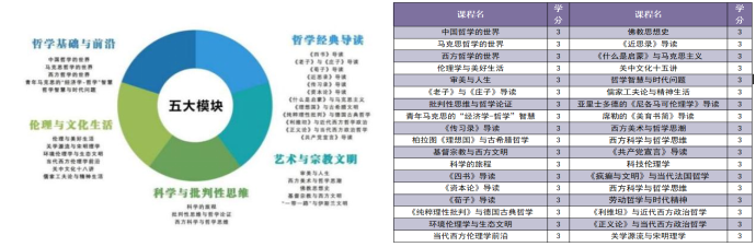 建设了“哲学基础与前沿、哲学经典导读、伦理与文化生活、科学与批判性思维、艺术与宗教世界”五大模块近40余门通识核心课程,每学期开设12-14门课程供学生修读。加盟书院的学生将接受系统的哲学通识课程教育,通过健全心性修养、优良德性养成和卓越思维训练,形成特定的哲学态度和气质,成为兴趣丰富、人格完整、头脑健全的通识人才、思辨型人才,拓展和提升在原有专业的发展空间与层次。