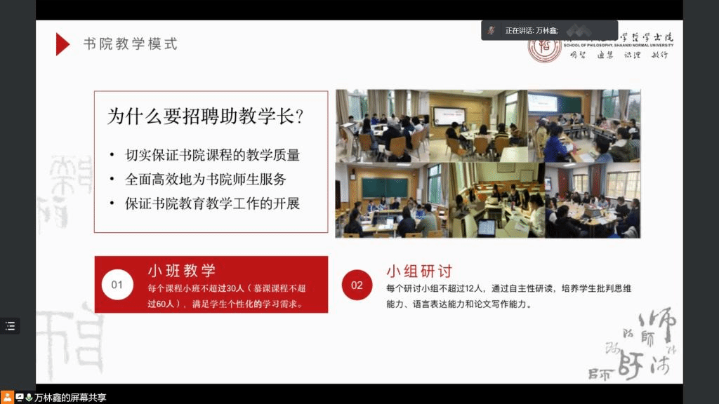 会议的第一项议程是由万林鑫老师介绍书院助教学长岗位的基本情况及工作职责等。万老师依此向助教学长们介绍了书院教学形式课程构成框架、助教学长的岗位职责讨论课相关说明以及工作中注意事项等方面讨论课是书院教学工作开展过程中的重要环节因此万老师对讨论课的开展细则以及时间节点等部分向各位助教学长进行了着重说明最后强调到助教学长在工作开展中应多跟任课教师、班级同学沟通交流,给予同学们必要的关心关怀,希望大家能够“用心用情”给予书院每位学生帮助