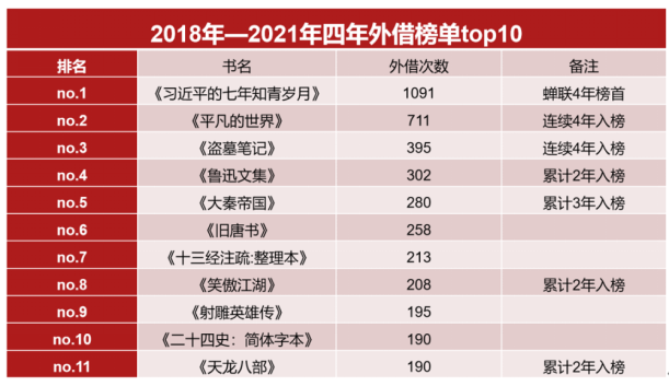 2018——2021年四年的“外借排行榜”书单进行整理,在“不同院校之间的横向对比”和“借阅数据的纵向对照”中,希望一窥高校的阅读特点,把脉师生的学风倾向,并尝试提出动态化、深刻性的观察意见。