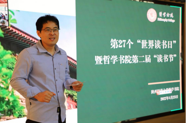 活动第一项:袁祖社教授致开幕辞。袁老师分别从“书籍,连接古今,贯通中外”“读书,涵养气质,承继文化”“最是书香能致远”三个维度向大家介绍读书的裨益,同时也表达了对书院的展望,未来希望在硬件和软件上争取给同学们创造了更好的读书氛围和环境,帮助大家开眼界、启心智。他强调,要开展多种形式的活动庆祝“世界读书日”“世界哲学日”等有意义的日子,彰显书院的育人指向——立德树人,以文化人;坐而论道,起而践行。他对同学们提出殷殷期许,希望同学们利用好书院提供的各种平台,把读书和学习作为一种追求、一种爱好、一种健康的生活方式,让阅读蔚然成风。最后,袁院长表达了对本届读书节活动圆满举办的衷心祝愿!