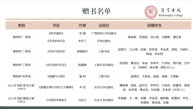 活动第四项:一起向未来——嘉宾赠书。“茶亦醉人何须酒,书能香我无须花”,在书院中有那么一群人,沉浸于图书馆的一方天地,遨游于书海的广阔空间,他们是书院的“读书之星”,是图书馆的“镇馆之星”,更是在“善思杯”通识论文大赛中取得佳绩的书院代表。为引导学生培养多读书、勤读书、读好书的习惯,拓宽学生视野,丰富书院学子们的精神生活,书院特别购置了一批由知名学者和书院导师所推荐的经典书目,以赠书的形式对同学们加以勉励。