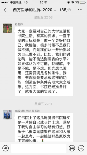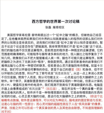 在三天的三组讨论中,大家都仔细听取了其他同学汇报,提问积极,气氛活跃,不同学科背景的同学围绕心身关系、他心难题、机心问题展开交锋,梳理了功能主义、解释主义、自然主义等不同流派的理论,并引证“缸中之脑”、“中文屋”、“忒休斯之船”等例证与思想实验展开讨论。汇报人也尽力解答提问,其他同学回应,助教主持并为大家打开思路、补充相关知识。在本课程的第一次在线小课堂上大家畅所欲言。老师旁听了同学们的讨论,在最后做了总结发言,对大家用心的准备工作和积极的现场表现作出了表扬,也指出一些问题,并期待大家下次的表现。下次讨论课会采取原著导读方式,并吸取经验,以更成熟的模式保障大家的学习需要。