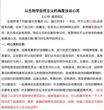 4月9日至11日,《西方哲学的世界》课程进行了本学期第一次研讨课,论题为“我(心灵)只是脑吗,脑只是运算程序吗,根据本课程所学你对心灵的认知是怎么样的?进一步探讨心身关系,以及心灵与他者(他人)、他物(动物、机器人)的界线,要求聚焦于“心灵”。此论题的选取源于在上月授课的“心灵”章节,有同学提议老师可以就一种学说与同学们展开批判与辩护,助教结合前几次讨论中同学们普遍非常感兴趣的人工智能话题,给了大家比较大的发挥空间。4月5日交电子版讨论稿至助教,助教批改回复;讨论课分三组,每组约十人,以腾讯会议为平台,每次时长2小时,同学们自由选组,也可旁听其他组。