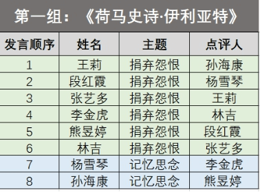 经过前期充分准备,2020年春季学期《审美与人生》课程的“古希腊智慧”系列讨论课于教学第七周陆续拉开帷幕。4月6日与4月10日晚19:30至22:00在微信讨论群分别举行了第一、二组讨论课。本周讨论课主题为“《荷马史诗·伊利亚特》中的哲学智慧”,围绕“缪斯的记忆与思念”及“阿基琉斯的捐弃怨恨”两大问题展开讨论交流。两组共有来自不同院系专业的十七名同学参与,课程助教敖安娜担任主持人。