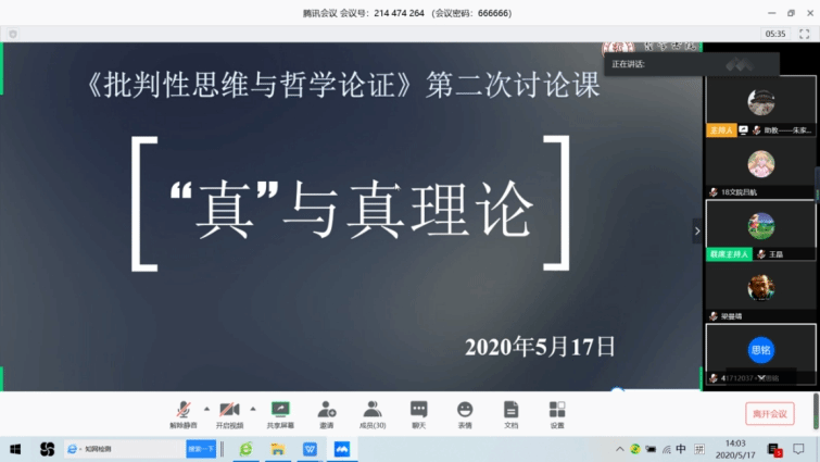 开设的一门通识核心课程,由我院哲学系王晶老师负责讲授。在疫情防控的收尾阶段,按照校院“如无必要不返校”的要求,在书院的领导下,《批判性思维与哲学论证》这门课程继续有条不紊地开展着线上教学工作,照常推进教学计划。根据课程讲授计划安排,本课程的第二次讨论课于5月17日(星期日)在腾讯会议上成功举办,本次讨论课的主题为“‘真’与真理论”,长安与雁塔两个校区班的各年级、各专业的选课同学全员参加。