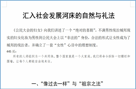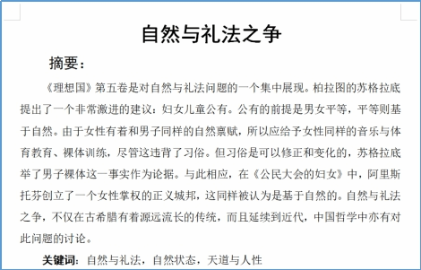 第三,在更广的阅读范围中,有不少同学对照了中国古代思想和历史中的“自然”与“礼法”,如张敬悦、王菲、马馨玥、马伊卓和刘洋同学。也有陈宝敏同学对照了《法律篇》与亚里士多德的相关论述。