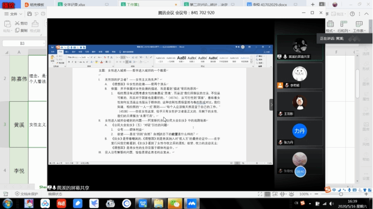 第四,从文本中女性、家庭这样较小的问题切入分析,看主题中的张力如何显现,如黄溪、王迪清同学。或就具体问题对柏拉图提出批判,如王菲同学。也有出于当代生活中的这一“张力”进行的思考,如王羽彤和杨龙同学。