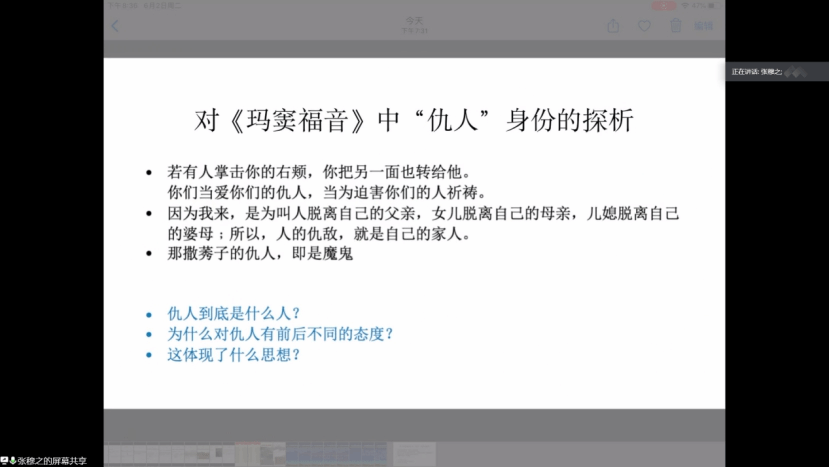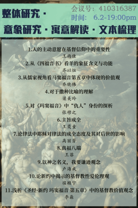 “整体研究·意象研究·寓意解读·文本梳理”为主题的第四组讨论于6月2日晚顺利举行。讨论开始前,宗老师照例对主题文本的大致情况作了介绍,主要涉及《旧约》和《新约》的关联以及本次所讨论的文本的重要意义。她特别指出,基督信仰的价值观念在历史上改变了人们对待生命和弱势群体的态度,体现了其以“爱”的原则为核心的特质。应当尽量用科学的、客观的态度去解读和评价《圣经》,可以予以批驳,但即便如此,也应以敬畏的心态去对待。