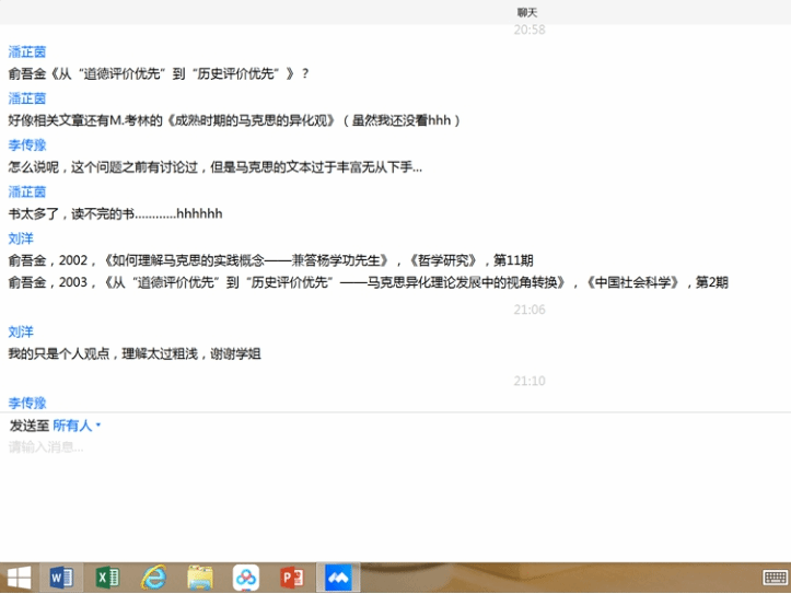 西方马克思主义者在研究马克思的过程中也没有忽视他的核心概念——实践,不少同学也对西方马克思主义者实践观进行研究。杜雪曼顺着现代性这一脉络,从马克思开始,研究实践与劳动的关系。黄溪关注阿伦特《人的境况》,试着解读阿伦特理论中“制作”对“行动”的蚕食。廖明一同样关注人的境况问题,他阅读的文本是马尔库塞的《单向度的人》。刘洋探讨了“时间与实践”这一主题,谈及吉登斯、海德格尔、布迪厄、马尔库塞等人的理论。认为实践与时间无法分隔。李传豫阅读了布迪厄的《实践感》,梳理布迪厄的实践体系,并对马克思与布迪厄理论异同进行分析阐述。