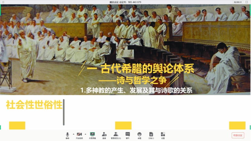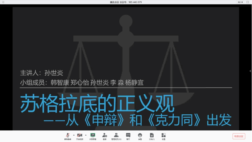 《西方哲学的世界》课程第二次讨论课于6月13日晚7点在腾讯会议平台进行,由任课教师点评、助教主持,全体31位同学参加了本场讨论课。本次讨论课在为期一个月的“苏格拉底云读书会”基础之上进行,在读书会中,大家对《苏格拉底的申辩》和《克力同》进行了非常细致的阅读和讨论,本次讨论课以《苏格拉底的申辩》、《克力同》为文本每组自定主题,围绕主题成稿并作小组汇报。形式为分组准备+集中展示,小组形式能使大家互相启发,并体会苏格拉底以及柏拉图学院、古希腊哲学中对话思考的形式。