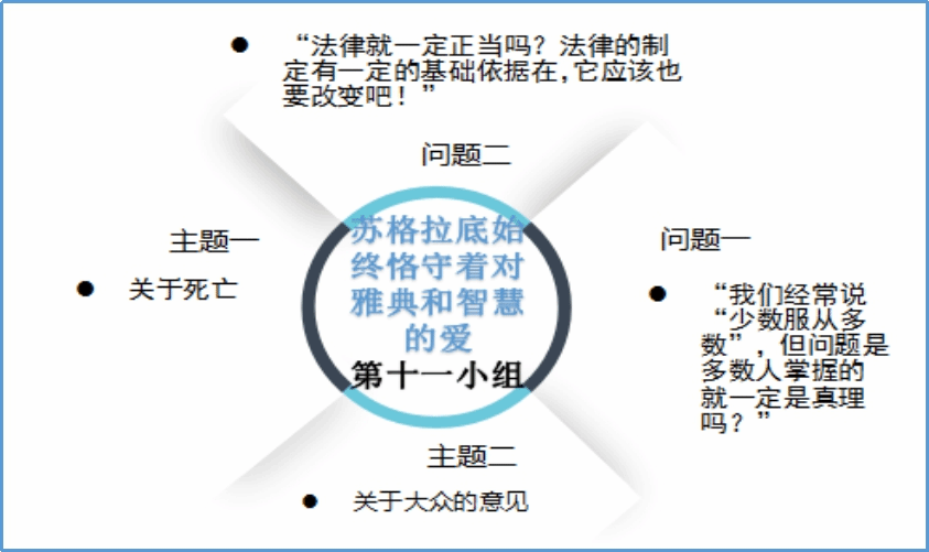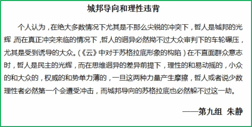 专业导师石碧球老师带读。本次读书会采用了老师导读,小组讨论,成员撰写阅读心得,集中讨论,最后小组互评和老师点评的形式,同学们积极参与,讨论热烈,收获良多。在逐步深入的交流中,师生共同走近苏格拉底,领略了苏格拉底的智慧,走近那个伟大的时代,探讨了古希腊雅典时期的时代特征。每个小组成员都受益颇多,不仅学习到了深厚的经典知识,而且在和小组成员的交流讨论中碰撞出了思想的火花,并且穿梭时空和苏格拉底进行了充满智慧的对话,可谓一举多得。到此,西方哲学经典“云”读书会圆满结束,虽然读书会已经结束,但其带给我们的启发却令人回味无穷,相信同学们也在这过程当中进一步了解了古希腊雅典文化,也更加激发了同学们对其的兴趣。生命不息,阅读不止!望同学们继续在学海中探寻自己的智慧!继续充实自己!
