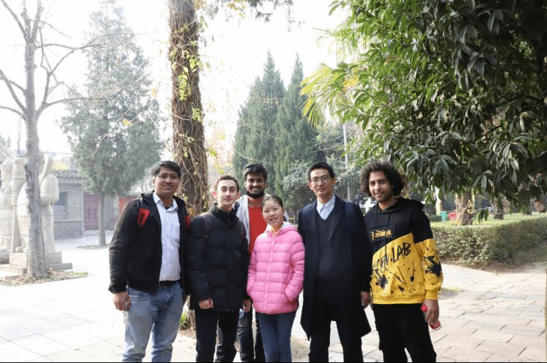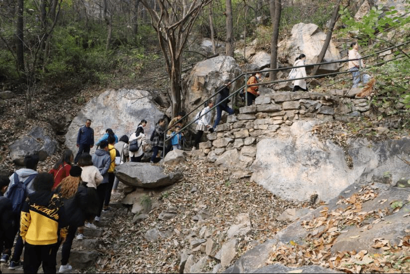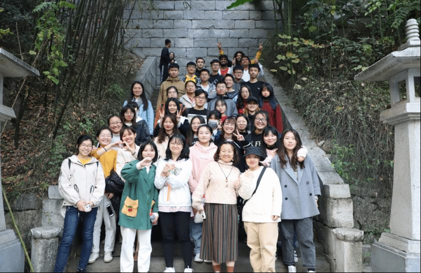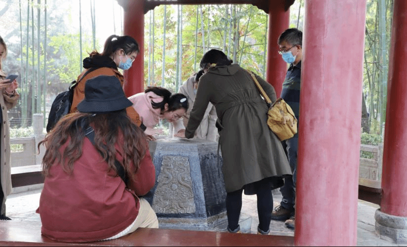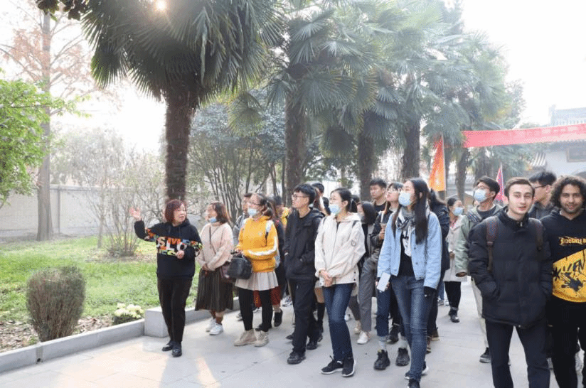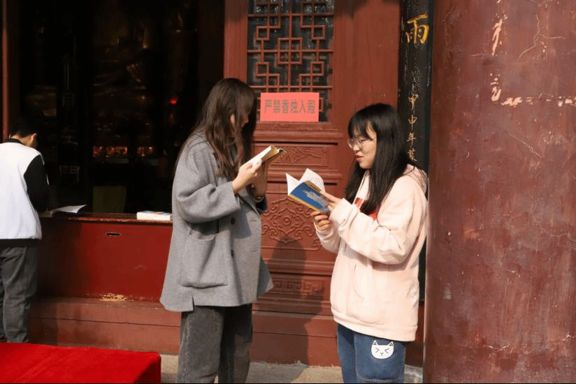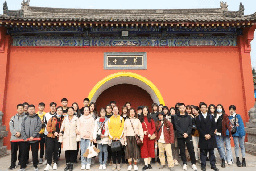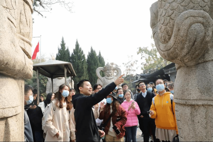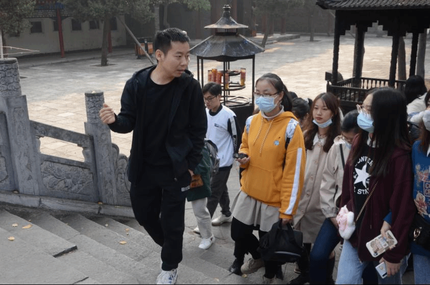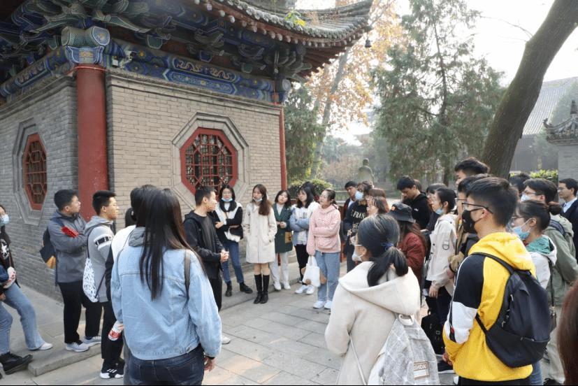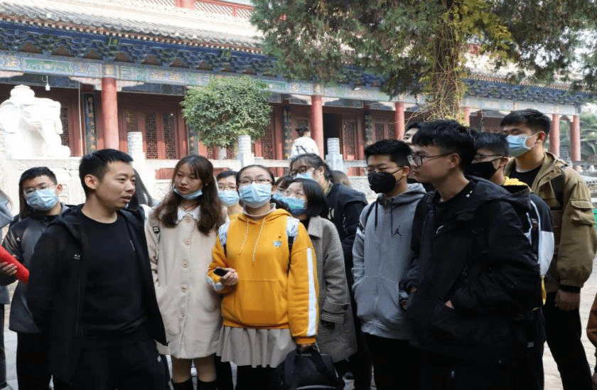 四十分钟的车程后,师生到达了位于鄠邑区祖庵镇的重阳宫,跟随讲解员参观了大殿、纪念塔、脚印石、百年银杏,了解了王重阳修行问道的过程,领略了道教文化的源远流长与博大精深。在参观中,同学们谈及金庸先生的小说《神雕侠侣》,“终南山下,活死人墓,神雕侠侣,绝迹江湖”,师生们将武侠小说与道教相结合,深刻学习了道教文化的历史意义与现实传承,并对道家礼仪也有了一定的了解。