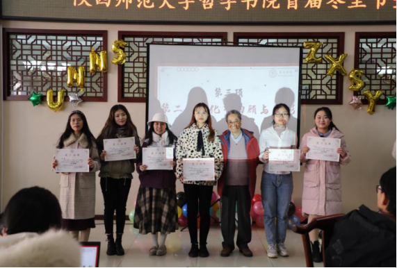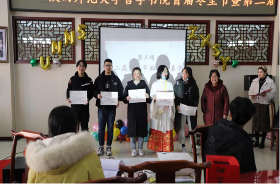 通过自编自导自演的原创历史话剧《大儒张载》,揭开历史的面纱,回顾先儒生命历程,溯关学遗迹,承先贤之风。韩月娥教授、金延教授为获得第二届戏剧节”最佳贡献奖”的同学们颁奖——2019级哲学与政府管理学院硕士研究生李文、王金驰,2018级物理学与信息技术学院本科生魏一波、外国语学院王晨雯、文学院潘芷茵、新闻与传播学院祁心悦,2019级哲学与政府管理学院本科生周可、黄昕萌、周璇、廖楚翘,2019级马克思主义学院高文洁。