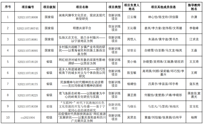 海角网 在本次立项中取得佳绩,共有10个团队获批立项,其中国家级4个,省级5个,校级1个。具体名单见下表: