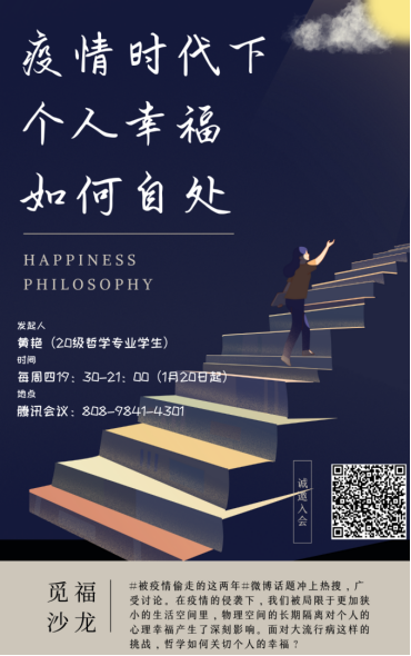 在沙龙第一期,为了让沙龙小伙伴们更加了解幸福为何,为了推动后续讨论的开展,本期主题拟定为哲学家们论个人幸福。希望同学们能从哲人的观点中寻找自己内心的答案,以便我们开展后续的研讨。同时,本期沙龙相当于我们的“破冰环节”,大家可以通过各位小伙伴的分享讨论,更好地认识彼此。