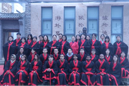 入泮大礼,是古代书院的开学大礼。当我真正穿上衣襟如风、袖如扇的传统汉服、系上束腰带、躬着身子齐额拜礼时,当奏乐悠悠响起,我们拜先师孔子、我们掬着礼等待先生在我们眉心点朱砂以开启智慧,我们诵读论语……我被这典雅庄重的仪式折服。