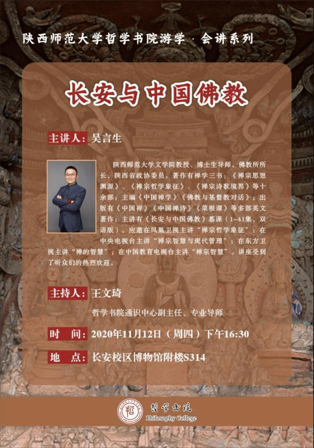 文学院教授、博士生导师,佛教所所长,陕西省政协委员。著作有禅学三书----《禅宗思想渊源》、《禅宗哲学象征》、《禅宗诗歌境界》等十余部;主编《中国禅学》《佛教与基督教对话》;出版有《中国禅》《中国禅诗》《菜根谭》等多部英文著作;主讲有《长安与中国佛教》慕课(1-41集,双语版)。应邀在凤凰卫视主讲“禅宗哲学象征”;在中央电视台主讲“禅宗智慧与现代管理”;在东方卫视主讲“禅的智慧”;在中国教育电视台主讲“禅宗智慧”。讲座受到了听众们的热烈欢迎。