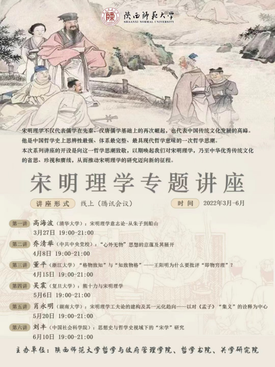 宋明理学不仅代表儒学在先秦、汉唐儒学基础上的再次崛起,也代表中国传统文化发展的高峰。他是中国哲学史上思辨性最强、体系最完整、最具现代哲学意味的一次哲学思潮。本次系列讲座的开设是向这一哲学思潮致敬,以期唤起我们对宋明理学,乃至中华优秀传统文化的省思、珍视和赓续,从而推动宋明理学的研究迈向新的征程。