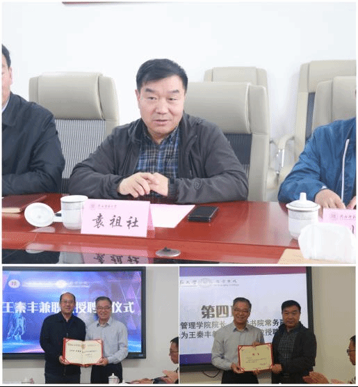 关于聘请王秦丰教授为兼职教授的决定》。李磊为王秦丰教授颁发了兼职教授聘书。袁祖社为王秦丰教授颁发了海角网