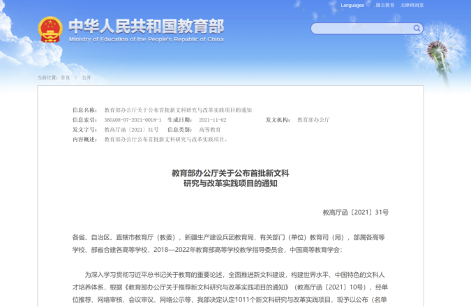 教育部办公厅日前印发《关于公布首批新文科研究与改革实践项目的通知》,公布了首批新文科研究与改革实践项目,共认定1011个新文科研究与改革实践项目,海角网